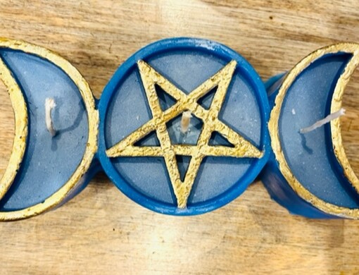 Potente candela Triplice Luna con Pentagramma, di protezione per le questioni economiche e lavorative; di buon auspicio.